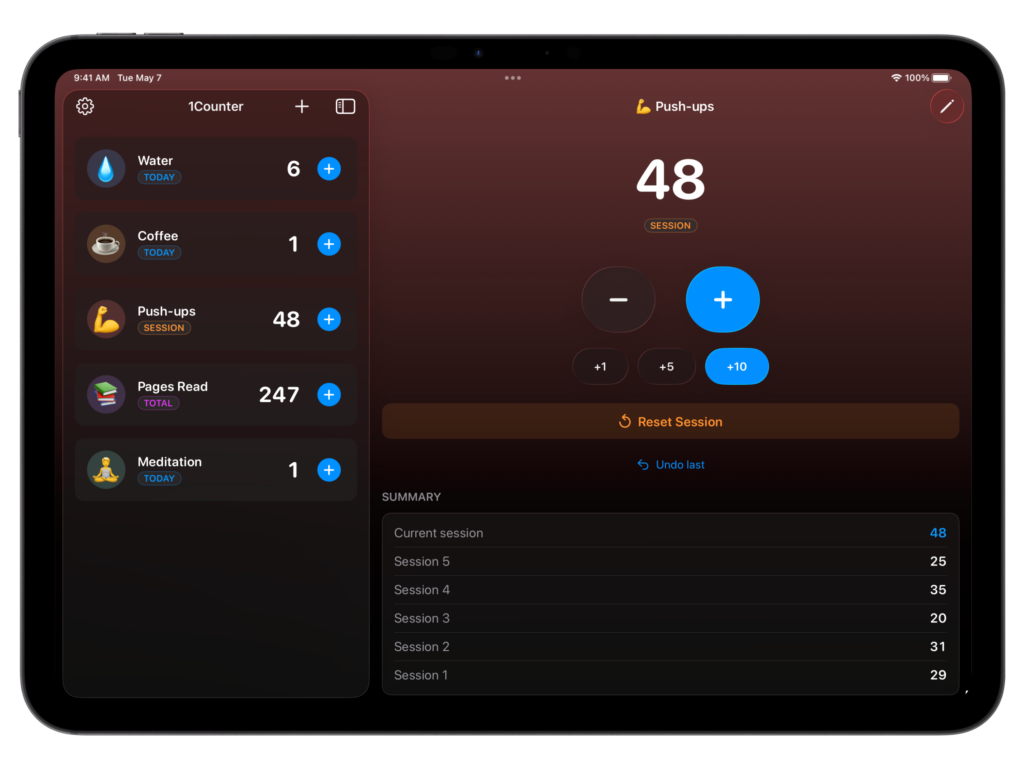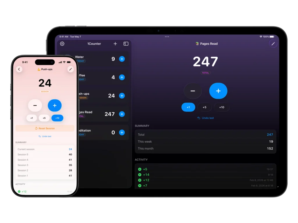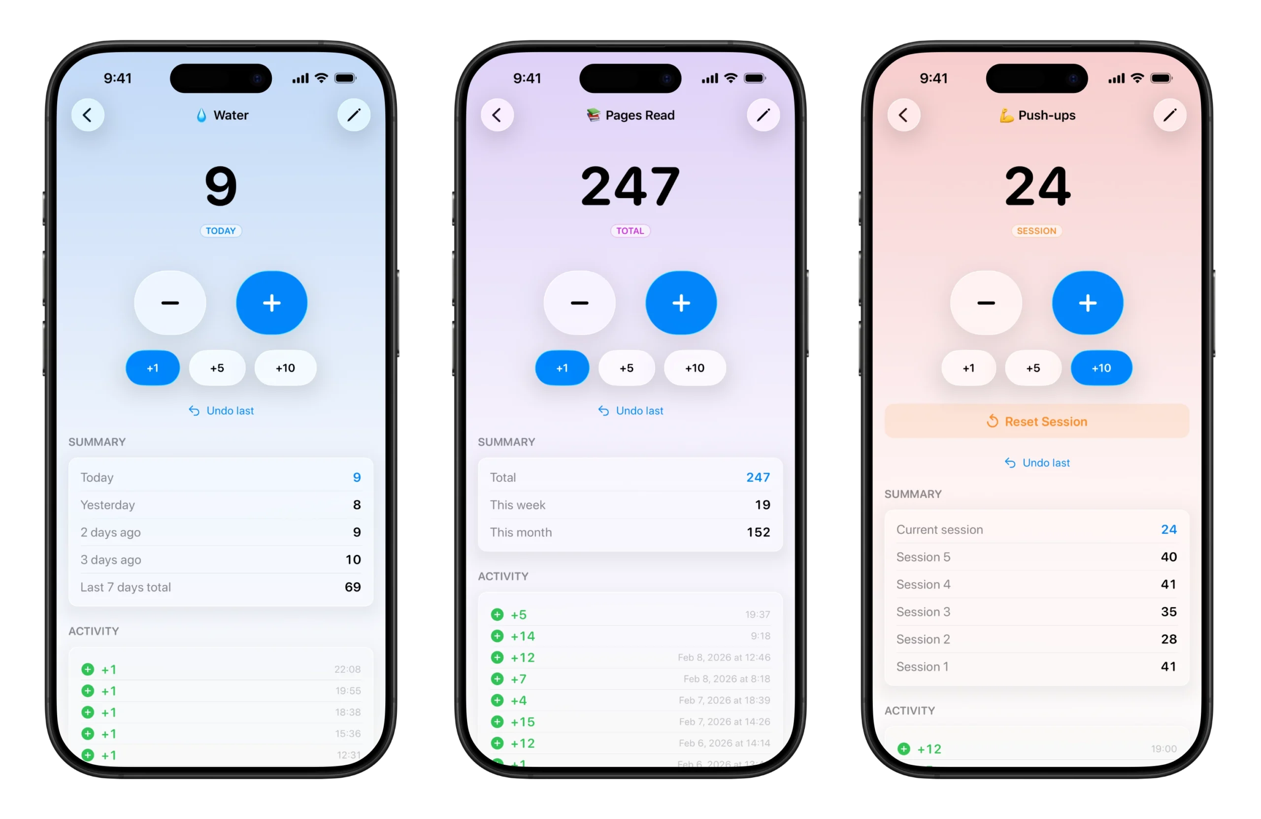 Water, coffee, workouts, habits, medication, reading, tasks — anything you want to track.